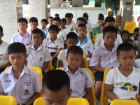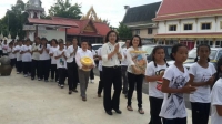 นักเรียนเตรียมพร้อมกันเพื่อเดินทางไปทำบุญที่วัด |