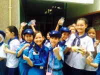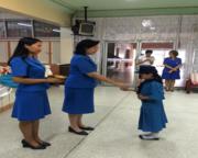 สมาชิกยุวกาชาดใหม่รับเข็มเครื่องหมายจากประธานในพิธี |