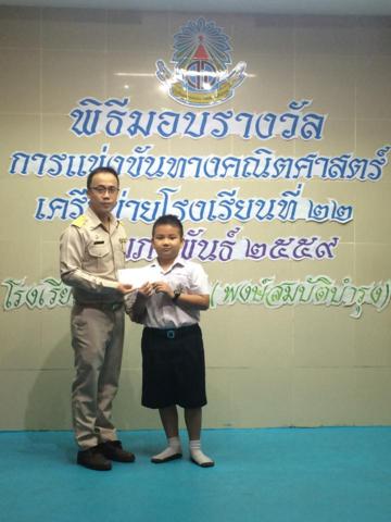 เด็กชายโยธิน รู้ทัน รางวัลที่ 3 การคิดคำนวณ ป.6 การแข่งขันความสามารถทางคณิตศาตร์ของครูและนักเรียนเครือข่ายโรงเรียนที่ 22 |